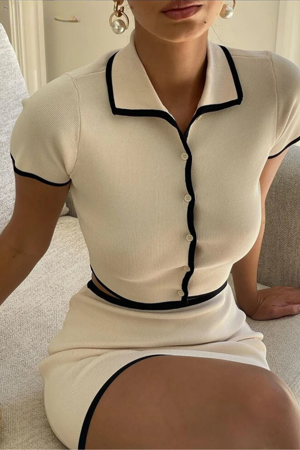 Elevate your wardrobe with the Mia Two-Piece Set, a stunning combination of sleek lines and refined design. This elegant set features a form-fitting top with stylish black piping and a matching mini skirt that perfectly balances sophistication with a modern twist. Available in this neutral tone, this versatile outfit will seamlessly take you from brunch to an evening out with friends.