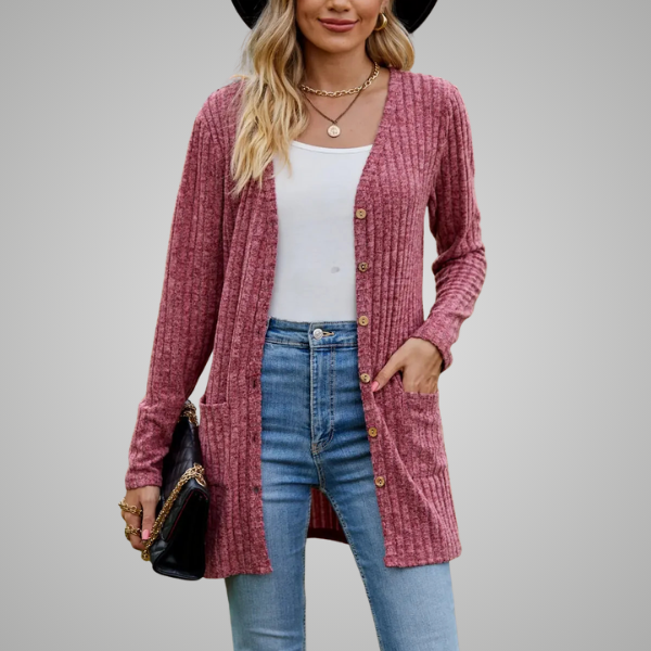 This cardigan features a long, relaxed silhouette with vertical ribbed detailing for a lengthening effect. It buttons down the front for versatile wear and includes two front patch pockets that add both style and practicality. The lightweight design makes it an ideal layering piece over casual tops and denim.